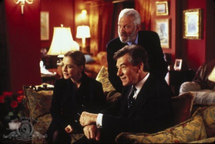 Today’s cinema adventure: Six Degrees of Separation, the 1993 adaptation of John Guare’s Pulitzer-nominated play of the same name, starring Stockard Channing, Donald Sutherland and Will Smith, with a screenplay by the playwright himself. Through the tale of a well-to-do Manhattan couple whose lives are infiltrated by a mysterious and charismatic young con artist, Guare uses his gift for language to explore how our connections to other people weave us into a tapestry of shared experience and lead us to new perspectives on our lives and ourselves, and to subtly reveal how the parallels between us transcend the illusory differences of class, race, sexuality and culture and expose the sometimes uncomfortable truths which unite us all; however, in the translation from stage to film, the complex, literate and emotionally resonant dialogue sometimes borders on sounding awkward and stilted, the central premise comes across as contrived and unconvincing, and the powerful revelations of the play seem almost artificial and trite. The fault lies with director Fred Schepisi, who- instead of utilizing the potential of the cinematic medium to enhance and illuminate the play- has taken the rather pedestrian approach of grafting it into a straightforward narrative, expanding the action into a variety of real-world settings which only serve to distance us from the characters and undermine the cumulative power of the unfolding story. The endless progression of upper-crust social gatherings and well-appointed locations continually remind us that we are watching a movie about the problems of spoiled rich people, instead of providing us with the class-dissolving intimacy of a more abstract theatrical experience; and as a result, instead of an emotional catharsis, we are given an intellectual exercise. Nevertheless, the power of Guare’s original work shines through (albeit in diluted form) thanks to the talented ensemble cast, which clearly relishes the opportunity to speak his words and embody his characters, and if the movie is ultimately a bit disappointing, they at least ensure that it is never boring. Sutherland is, as always, interesting to watch, and Channing does possibly her best screen work here- she earned a well- deserved Oscar nomination for her performance; Ian McKellen shines as wealthy dinner guest who is also taken in by the young hustler, as do Heather Graham and Eric Thal as a younger, less affluent couple whose experience with him yields considerably more tragic results. In the key role of the enigmatic stranger, Will Smith copiously displays the charm that made him a star; but my favorite performance comes from Anthony Michael Hall, whose brief appearance as a key character steals the show and makes us keenly regret his relative disappearance from the film industry. As a side note, from the standpoint of social history, Six Degrees represents a minor landmark in the acceptance of gay-themed subject matter in mainstream cinema with its inclusion of the con man’s homosexual trysts, which may generate interest for some viewers; for everyone else, however, it’s a film that is worth the time investment, for the sake of the performances and the opportunity to experience Guare’s script- just manage your expectations, or you may end up feeling you are the one who’s been conned.