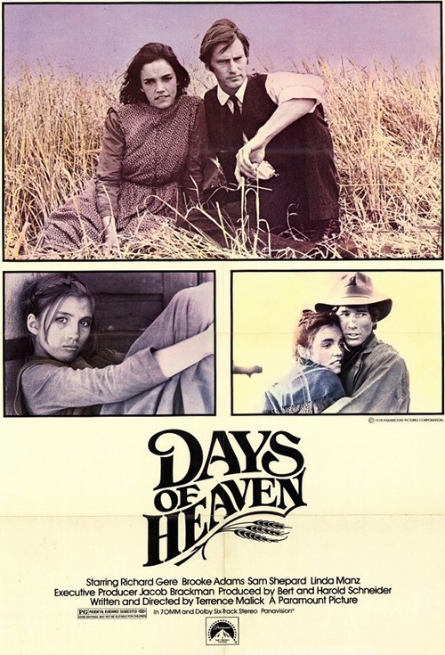 Today’s cinema adventure: Days of Heaven, the 1978 second feature by director Terrence Malick, featuring a young Richard Gere alongside Brooke Adams and actor/playwright Sam Shepard in an elegiac tale of two migrant workers who scheme to con a dying farmer out of his fortune on the early-20th-century Texas panhandle. Universally lauded for its visual beauty, it was nevertheless snubbed at the time of its release by critics who found it shallow and unengaging; in the years since, however, it has come to be recognized as one of the best films of the seventies, perhaps partly due to a two-decade hiatus taken by its director following its completion, during which time a sense of nostalgic retrospect- coupled with wide exposure on art-house cinema screens, cable TV, and home video- prompted a re-evaluation of its merits.