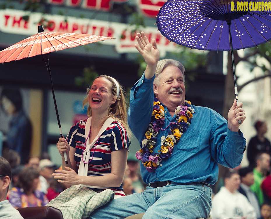 Actress Laura Linney, left, and author Armistead Maupin, the grand marshals of the Gay and Lesbian Pride parade, wave to the crowd from an open car on Market Street in San Francisco, Sunday, June 29, 2003. (D. Ross Cameron/The Oakland Tribune)