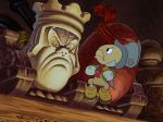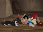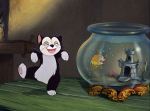 Of course, no matter how fully-realized this spectacular world may be, it must be populated if the story is to be told.  The characters in Pinocchio– even the minor ones- are as richly developed as the elements which surround them, designed and animated to such specific perfection that the breadth of their characterization is visible in every frame they inhabit: Jiminy Cricket, with his instantly likable blend of gentility and earthiness; Honest John the Fox, the picture of tawdry pretension and avaricious hunger, and his mute sidekick Gideon the Cat, a sort of skeevy Harpo Marx; Stromboli, a menacingly immense combination of flamboyance, volatility and mean-spirited cruelty; Lampwick, the ultimate hoodlum, cocky and uncouth, yet ultimately pitiable as he suffers the direst fate of any character in the film; even Monstro the whale, aptly personifying the unstoppable, chaotic wrath of the universe; and, of course, Geppetto, lovably dotty and infinitely kind, with his pets, Figaro and Cleo, the lovable kitten and goldfish pair that provide gentle comic relief with their yin-and-yang interplay as they respond to the various events taking place around them.  As for the star of the show, Pinocchio is crafted as the epitome of innocent boyhood; his sweet nature and his excitement for the brave new world before him are his defining characteristics, and he is in a constant state of action, exploring possibilities, embracing experiences, and honestly seeking to please- even when he lies to the Blue Fairy, we get the sense he is doing it as much to save her from disappointment as to save himself from trouble.  As a result, he comes off as a plucky and enthusiastic young hero, instead of the cloying and disingenuous brat he could so easily have become if his creators had chosen to make him deliberately cute or precocious.