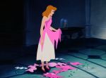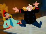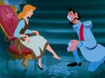 The basic plot of Cinderella dates back to ancient times, and can be found in folklore from a wide range of cultures and eras.  One version even found its way into Shakespeare’s King Lear, albeit with a tragic twist, through the story of the mythic Princess Cordelia, who not only marries her dream prince but defeats her cruel and ambitious sisters with his army; another dark variation on the tale can be found in the stories of the Brothers Grimm, who included such details as the stepsisters cutting off portions of their feet and their being blinded by attacking birds.  The most familiar version today, however, arises from Perrault’s story, which added the iconic elements now indelibly associated with it, including the fairy godmother and the magic pumpkin coach; Disney’s artistic team used this as their source, eliminating some of the darker aspects and placing a heavy emphasis on the peripheral adventures of the heroine’s animal allies, which are played for child-pleasing comic effect.  Indeed, the main events of the plot comprise relatively little screen time, and the story is largely told through the behind-the-scenes perspective of the mice, whose machinations are largely responsible for Cinderella’s eventual triumph.  The film opens with a narrated prologue in which the tale’s background is set; Cinderella is the daughter of a widowed aristocrat who takes a second wife with two daughters of her own, hoping to provide his child with a motherly influence, but upon his premature demise this new stepmother becomes a domineering tyrant, forcing Cinderella to live the life of a servant while doting on her own vain and mean-spirited girls.  Despite her lowly existence, Cinderella grows into a lovely and sweet-natured young woman, befriending the animals of the household, including the mice and birds, and treating them all with kindness- even her stepmother’s spoiled and vindictive cat, appropriately named Lucifer.  One day, an proclamation arrives from the palace that all eligible young ladies in the kingdom are invited to a royal ball in honor of the Prince, whom the King hopes will choose a bride from among them; Cinderella hopes to attend along with her stepsisters, but their scheming and jealous mother burdens the girl with extra chores in order to prevent her having the time to prepare a suitable dress.  Her loyal animal friends manage to make a lovely gown from the cast-off scraps of the stepsisters’ wardrobes, but when the elated Cinderella rushes to join her family as they prepare to depart, the two selfish girls accuse her of theft, and rip the borrowed items from her dress, leaving her in tatters as they head off to the palace.  Her tears of despair quickly disappear, however, when a kindly old woman materializes, proclaiming that she is Cinderella’s fairy godmother; she promptly transforms a pumpkin into an elegant coach and the girl’s torn dress into a sumptuous gown, and sends her off to the ball- admonishing her, however, that she must return before midnight, when the spell will be broken and all her magical accoutrements will return to their original, non-enchanted form.  At the palace, the young Prince is bored and unimpressed by the procession of bachelorettes vying for his hand- that is, until the late arrival of a mysterious beauty, to whom he is immediately drawn.  They waltz together and wander the palace grounds- until the clock begins to strike midnight, when she hastily flees, leaving behind no clue to her identity except a single glass slipper, lost on the palace steps in her hurry to escape before the final chime can break the spell and reveal her lowly state.  Determined to find the mystery girl who has won his son’s heart, the King declares that the slipper will be tried on the foot of every maiden in the kingdom until a match is found, but Cinderella’s destiny may still be jeopardized by the efforts of her malicious stepmother, who is bent on seizing this last chance to secure a royal marriage for one of her own unpleasant children.  With time running out, it will be up to the heroine’s animal friends to come to the rescue and ensure that her “happily ever after” dreams will at last come true.