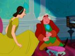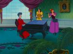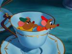 Watching Cinderella today, it’s remarkable to see the seeds of Eisenhower-era sensibility so clearly visible in its framework.  The “American Dream” is here encapsulated by the movie’s story of success earned by hard work and a positive attitude, and its focus on the feminine perspective emphasizes the role of women in that objectified way of life- namely, to strive for fulfillment through the ultimate life accomplishment of marriage to a successful man.  Cinderella, after all, is trained from the outset to be a devoted wife, with a deep attachment to her father and years of experience tending to every household chore; and her fitness as a mother is plainly seen in her nurturing relationship with her animal friends- particularly the two foremost mice, Jaq and Gus, who are more or less characterized as children in animal form.  Of course, the importance of beauty is also stressed, most strongly in the significance of Cinderella’s ball attire, with both the simple-but-charming dress constructed by the animals and the sumptuously dazzling gown into which it is magically transformed being afforded considerable weight in the film’s plotline.  Throughout the movie, even in the animal subplots, traditional gender roles are subtly reinforced, and the principal male characters- the human ones, anyway- are firmly established as the natural beneficiaries of masculine privilege, a status heightened by their identification as royalty in the hierarchy of the story.  On top of all these social foreshadowings, the visual design of the film is replete with precursors to 1950s fashion, from the rich color palette, to the lines of the clothing, to the predominance of old-fashioned Euro-elegance in the settings and decor.  As a final touch, the lush and dreamy music, at once catchy and soothing, fits directly into the mold of the popular songs that would dominate the sound of the coming decade- until the advent of Elvis and his rock-and-rolling ilk, that is.  In short, Cinderella, in the clarity of hindsight, looks very much like a blueprint for life in the ’50s, and one which may have had more influence on the shape of that decade than its creators had ever envisioned.