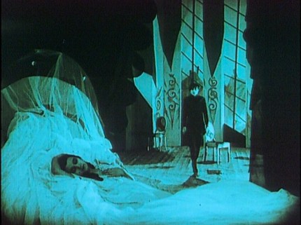 Though it was, of course, a silent film, music was nevertheless intended to play an important role in Nosferatu. Sadly, the original score composed to accompany its screening, written by Hans Edermann, was long thought lost. As a result, there have been numerous alternative scores created over the years, in styles ranging from lush orchestral romanticism to dissonant avant-garde minimalism. The print I watched recently (available on Netflix streaming video) features a score composed in 2000 by the Silent Movie Orchestra, consisting of a fairly contemporary-sounding ensemble utilizing such elements as electronic organ and heavy percussion; personally, I found it highly effective, but obviously it’s a matter of taste. Many feel that the score for a silent movie can only be appropriate if it is created in the style of- and with the instrumentation available in- the era in which the film was made; others have a more flexible preference, and obviously the majority of casual viewers will most likely find such a question immaterial (though I would venture to say that many of those who claim they cannot enjoy silent films are basing their opinion on the experience of seeing one with a generic, woefully inadequate musical accompaniment- the effect of music on this art form cannot be overstated). There are a number of prints available, with different scores to accommodate every taste, so if this aspect of the film is a concern, you would be well-advised to do a little research before choosing which version to watch. The now-reconstructed Edelmann score is featured on Kino’s restored print, which also offers probably the cleanest video quality available today, complete with the original, all-important chromatic tinting to differentiate day from night (in pure black-and-white, as most silent films were commonly shown for decades, time of day becomes a confusing issue); obviously, watching this edition is the best option, if possible; otherwise, there are numerous other versions available for free viewing online- after all, the movie is in the public domain, at least in the United States.